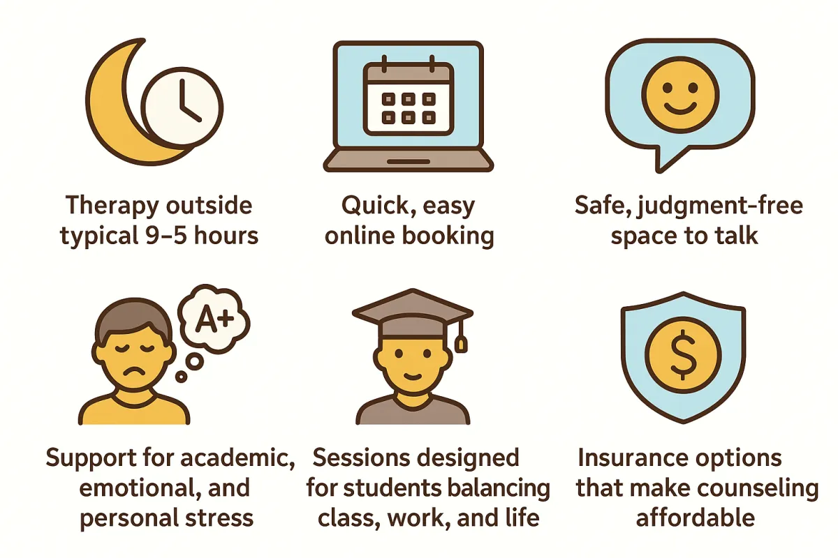 Life gets busy. Classes pile up. Stress hits at the worst times. Our licensed therapists offer calm, confidential support right when you need it — nights, weekends, or in between your real life.